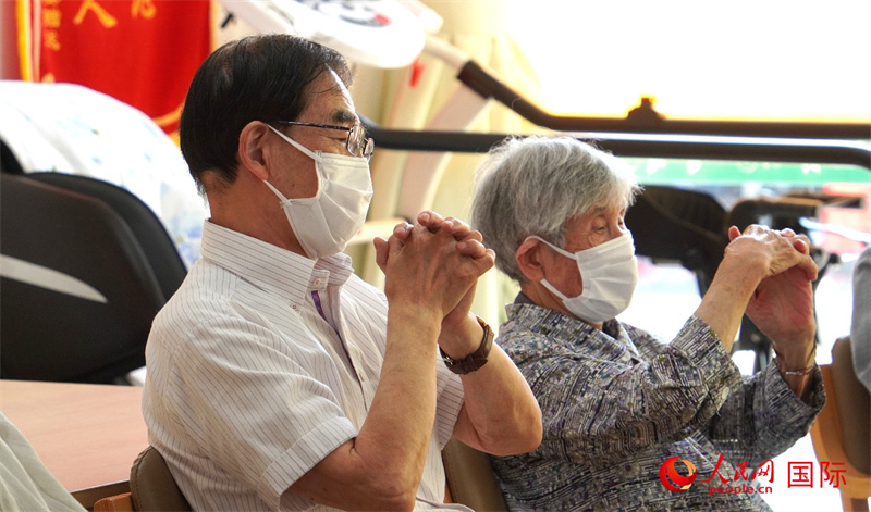 在日本的一家養(yǎng)老機(jī)構(gòu),清野明(左)和若生豐美(右)正在一起做手指操。人民網(wǎng) 許可攝