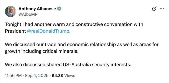 阿爾巴尼斯在社交媒體上發(fā)文稱,他與特朗普又一次進(jìn)行了“熱情而富有建設(shè)性”的對話。雙方討論了經(jīng)貿(mào)關(guān)系、關(guān)鍵礦產(chǎn)等合作領(lǐng)域以及美澳共同安全利益等問題。