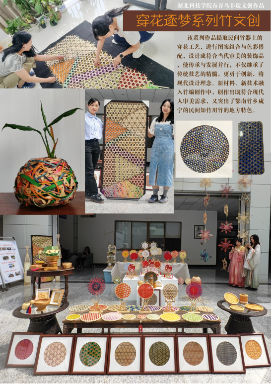 跨專業(yè)團(tuán)隊(duì)覆蓋設(shè)計(jì)、教育、傳播等領(lǐng)域,形成研發(fā)-推廣-銷售全鏈條。近年獲7項(xiàng)國家級(jí)/省級(jí)創(chuàng)業(yè)項(xiàng)目、17項(xiàng)專利、50余項(xiàng)學(xué)科競賽獎(jiǎng),2023年入選教育部傳統(tǒng)文化宣傳項(xiàng)目,2024年斬獲湖北省大學(xué)生藝術(shù)節(jié)二等獎(jiǎng)并亮相開幕展演,現(xiàn)場(chǎng)打造的“湖科大藝圓”竹編裝置獲專家贊譽(yù)。