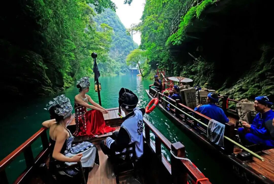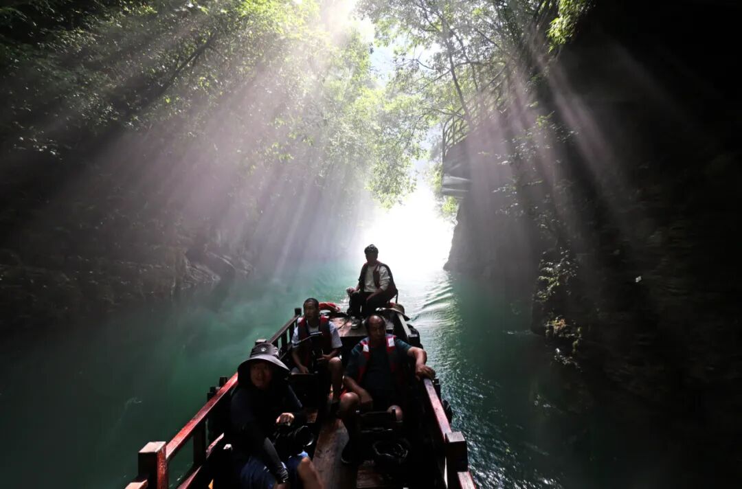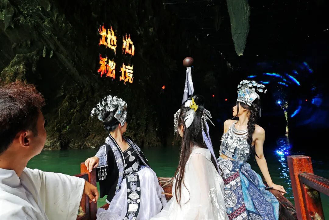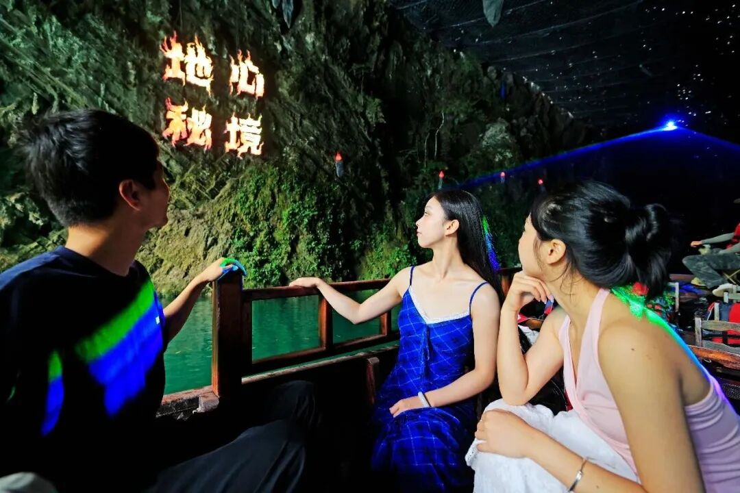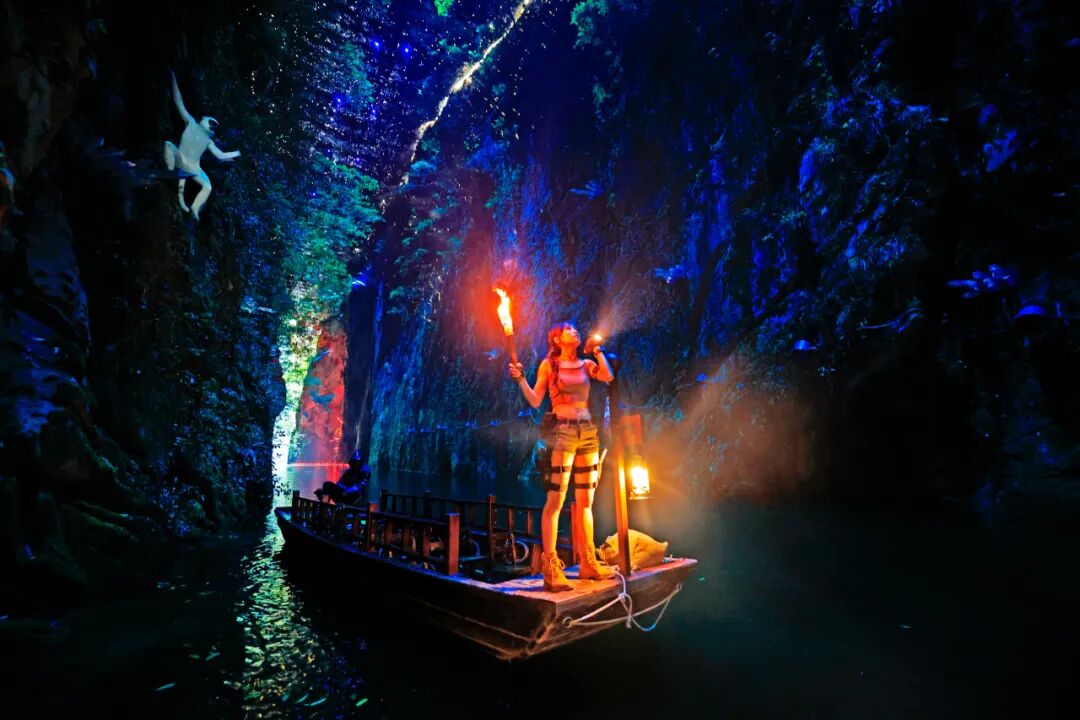 船只駛?cè)胗纳畹牡叵潞拥?,涼爽氣息撲面而來。七彩燈光投射在千年崖壁上,打造出如夢似幻的氛圍。在蜿蜒曲折的地下迷宮中穿行,每一次轉(zhuǎn)彎都可能遇見震撼的地質(zhì)奇觀。