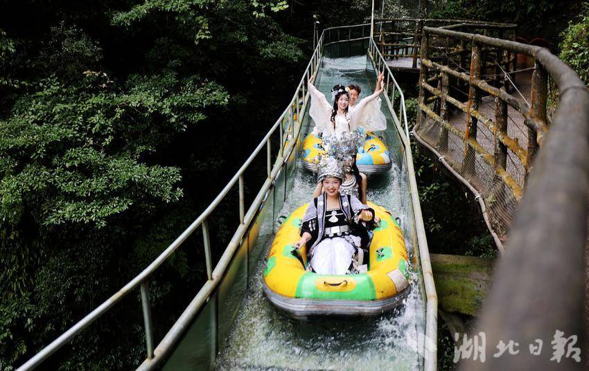 在恩施地心谷的懸崖絕壁間,地心崖漂帶來一場(chǎng)驚心動(dòng)魄的云端漂流。游客乘坐特制漂流艇,在垂直落差達(dá)200米的峽谷水道中疾馳,兩岸飛瀑如銀河傾瀉,巖壁如刀削斧劈,水流時(shí)而湍急如野馬奔騰,時(shí)而平緩如鏡面倒映天光。既有心跳加速的刺激感,又能近距離感受峽谷的壯美與幽深。