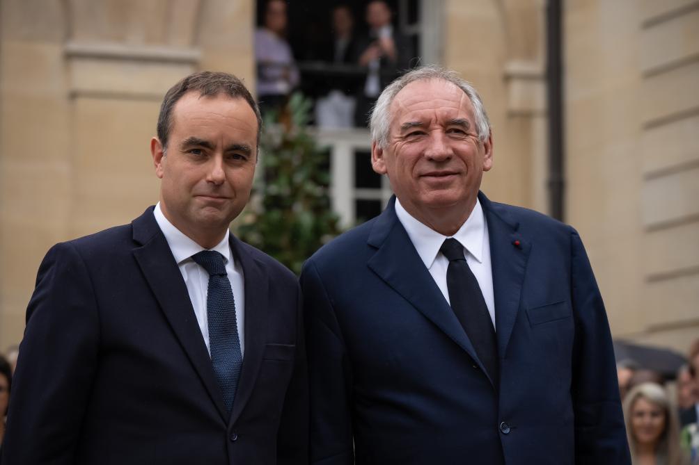 9月10日,在法國(guó)巴黎總理府,法國(guó)卸任總理貝魯(右)與新任總理勒科爾尼出席交接儀式。新華社發(fā)(奧雷利安·莫里薩爾攝)