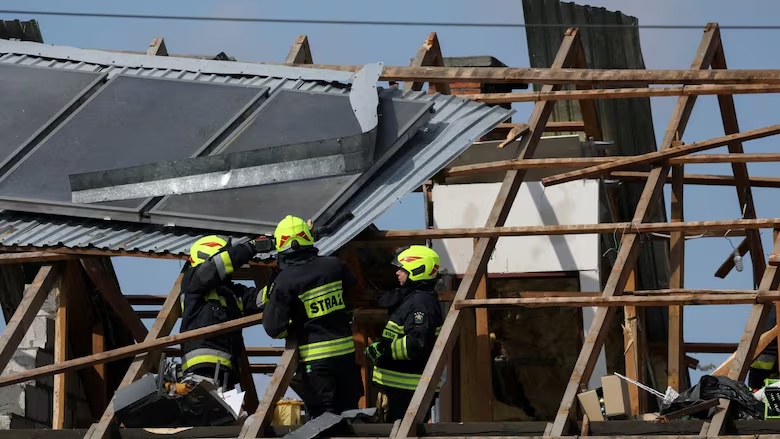 △波蘭盧布林地區(qū),消防員聚集在一座被無人機(jī)損毀的房屋屋頂上進(jìn)行檢查。
