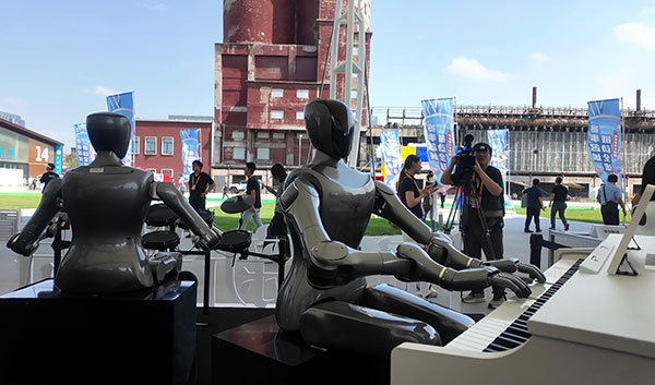 在服貿(mào)會體育服務(wù)展區(qū),機器人在彈鋼琴。人民網(wǎng)記者 吳凱攝