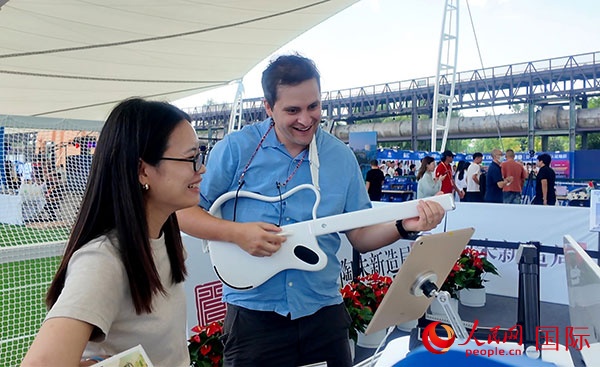 在服貿(mào)會體育服務(wù)展區(qū),觀眾體驗“陶朱新造局”帶來新材料制作的吉他。人民網(wǎng)記者 吳凱攝