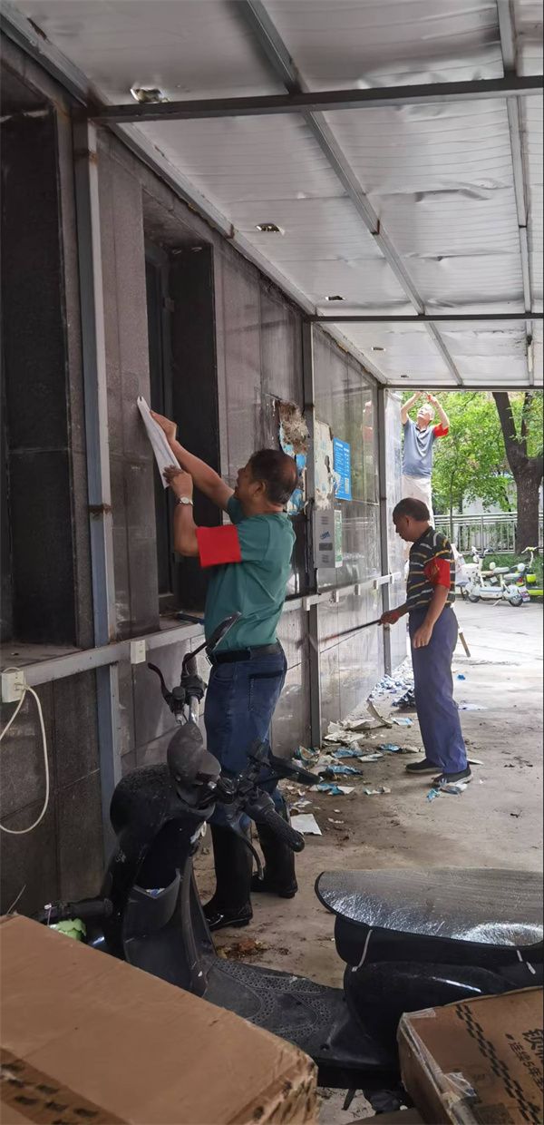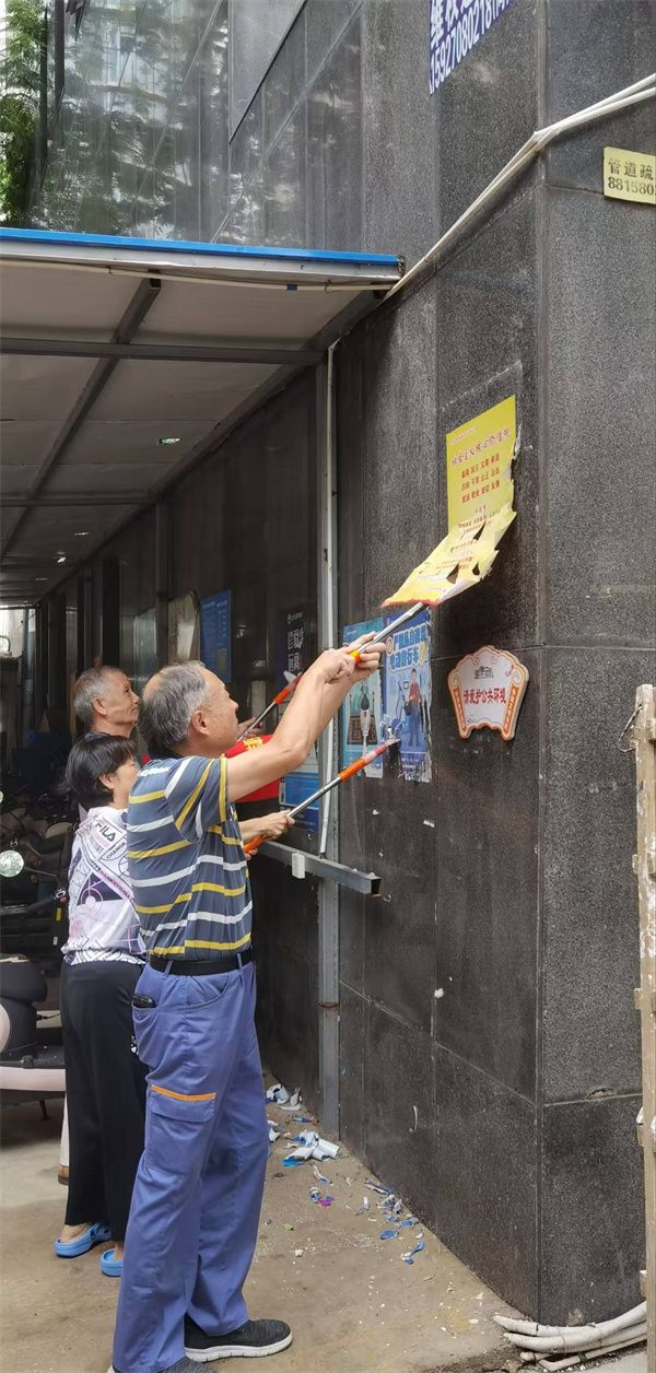 行動(dòng)中,志愿者們分為兩組,分工協(xié)作、高效推進(jìn)?!芭Fぐ_”清理組攜帶專業(yè)工具,對(duì)小區(qū)各樓棟墻面、單元門、電梯間及公共設(shè)施上的各類小廣告進(jìn)行徹底清理。面對(duì)黏附牢固的廣告貼紙,大家先以噴壺濕潤軟化,再細(xì)致鏟除,最后用抹布擦拭干凈,不遺漏任何一處衛(wèi)生死角。