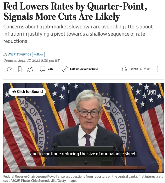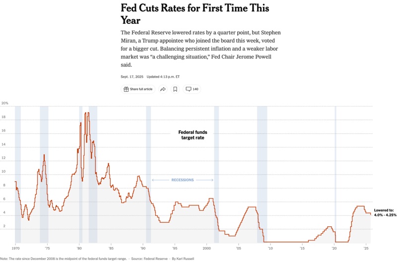 當(dāng)?shù)貢r間9月17日,如輿論預(yù)測,美聯(lián)儲宣布下調(diào)聯(lián)邦基準(zhǔn)利率25個基點至4.00%~4.25%的區(qū)間。這不僅是2024年底以來的首次降息,也是在就業(yè)市場走弱、政治壓力高企、全球市場高度關(guān)注下的一次“聚光燈會議”。從聲明到點陣圖,再到主席鮑威爾的記者會,釋放出的信號既有政策方向,也試圖表達美聯(lián)儲捍衛(wèi)其獨立性的立場。