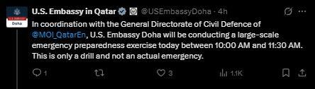 美國駐卡塔爾使館表示,美方此次演練與卡塔爾民防總局協(xié)調進行。