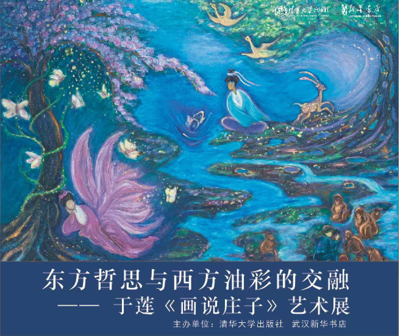 清華大學(xué)出版社特邀當(dāng)代藝術(shù)家于蓮,耗時(shí)三年創(chuàng)作 27幅莊子主題油畫,以中西合璧的筆觸詮釋“天人合一”哲學(xué)。巨幅三聯(lián)畫《鯤鵬之變》用漸變的藍(lán)紫色調(diào)展現(xiàn)莊子的宏大宇宙觀,四聯(lián)畫《至樂》則以明麗色彩解構(gòu)生死命題。