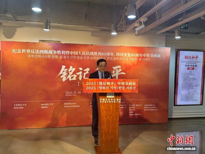 9月18日,《銘記和平——紀(jì)念世界反法西斯戰(zhàn)爭(zhēng)暨中國(guó)人民抗戰(zhàn)勝利80周年、韓國(guó)光復(fù)80周年中韓書(shū)畫(huà)展》在首爾中國(guó)文化中心開(kāi)幕。圖為中國(guó)駐韓國(guó)大使戴兵致辭。姜春雨 攝