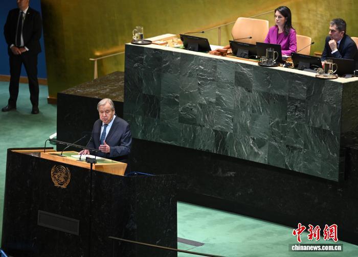 當?shù)貢r間9月23日,紐約聯(lián)合國總部,第80屆聯(lián)合國大會一般性辯論開幕。圖為聯(lián)合國秘書長古特雷斯在開幕式上致辭?!≈行律缬浾?陳孟統(tǒng) 攝