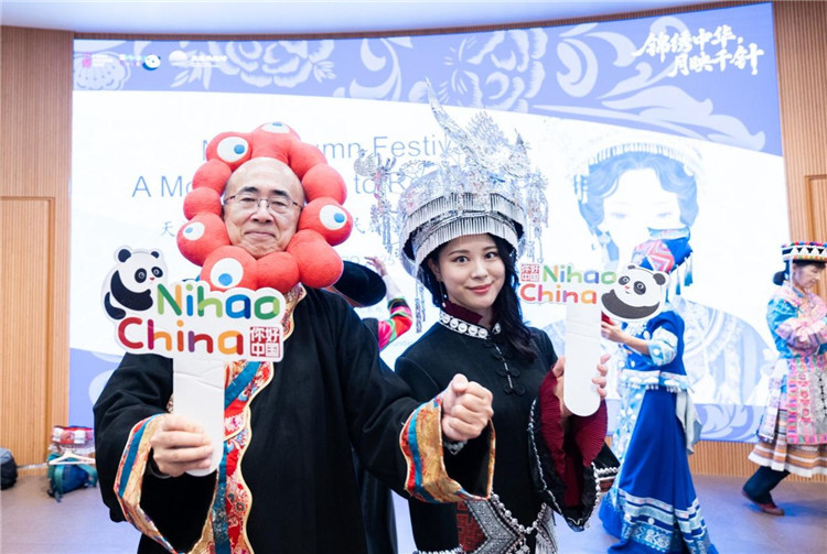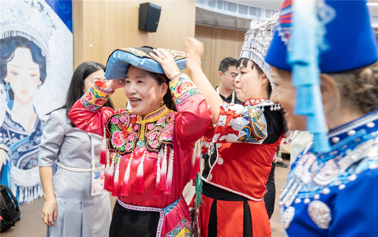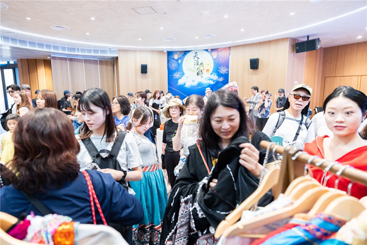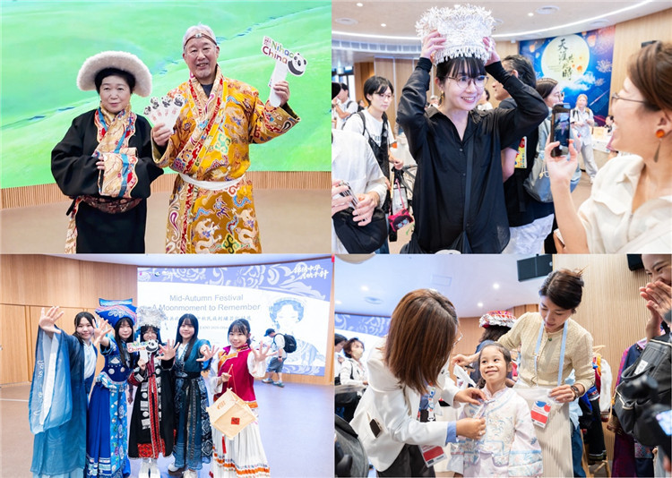 在互動(dòng)體驗(yàn)區(qū),參觀者們興致盎然地參與刺繡杯墊制作,在工藝師的指導(dǎo)下,親手繡制月亮、玉兔等圖案,體會(huì)一針一線中的匠心之美。在“月兔搗藥”香包與“中秋攬?jiān)隆睂m燈制作區(qū),嘉賓們?cè)趧?dòng)手創(chuàng)造的過程中,深入感受了中國(guó)傳統(tǒng)手工藝的趣味與智慧。民族服飾體驗(yàn)區(qū)尤為熱鬧,各國(guó)來賓紛紛換上苗族銀飾盛裝、藏族藏袍等民族服飾,拍照合影,留下難忘瞬間。