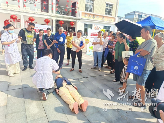 廣場另一側(cè),醫(yī)護(hù)人員鋪開模擬人體模型,演示燒傷包扎與心肺復(fù)蘇?!鞍惹鍧崅冢儆眉啿紡膫谙路酵蠈訉庸潭?,松緊度以能伸入一指為宜;做心肺復(fù)蘇時,按壓深度必須達(dá)5-6厘米,頻率保持每分鐘100-120 次,節(jié)奏就像跟著‘1001、1002’數(shù)數(shù)一樣均勻?!贬t(yī)護(hù)人員一邊說,一邊用手比劃著關(guān)鍵動作。講解完畢,邀請居民實操,遇到按壓角度偏斜、力度不足的情況,便俯身手把手糾正,耐心調(diào)整姿勢,確保每個人都能真正掌握正確要領(lǐng)。