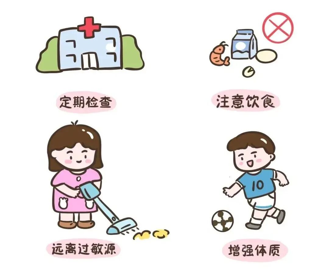 遠離煙草、花粉、寵物毛發(fā)、冷空氣等已知過敏原,積極預(yù)防呼吸道感染。