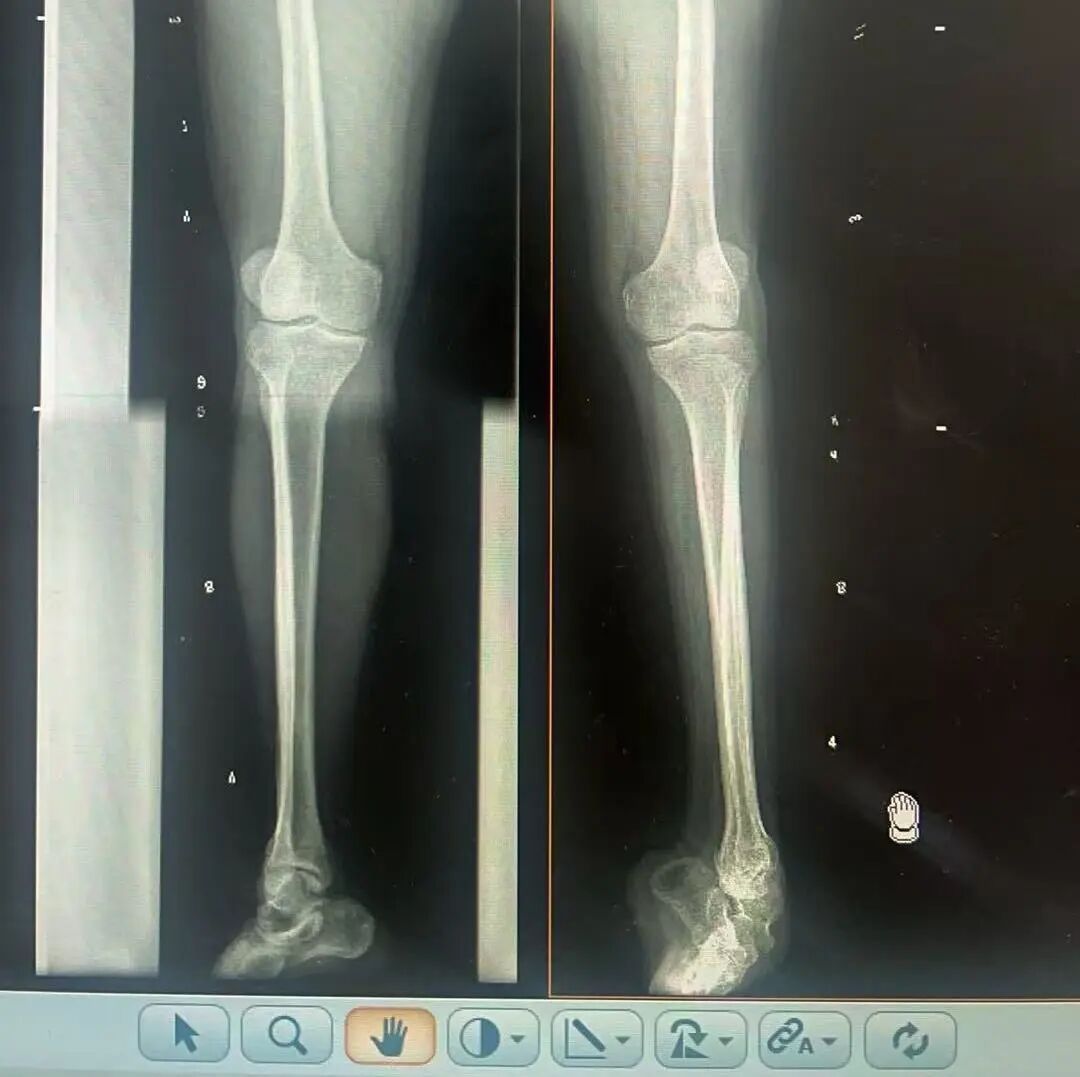 骨科隨即為陽先生進(jìn)行了全面的檢查。診斷明確而復(fù)雜:陽先生患有脊髓灰質(zhì)炎后遺癥、左踝馬蹄內(nèi)翻足、骨盆傾斜……面對(duì)這張沉甸甸的診斷書,由肢體功能重建顯微修復(fù)學(xué)科組長鄭群龍所帶領(lǐng)的醫(yī)療團(tuán)隊(duì)沒有畏懼,“這是一個(gè)家庭38年的堅(jiān)守與期盼,我們必須全力以赴”