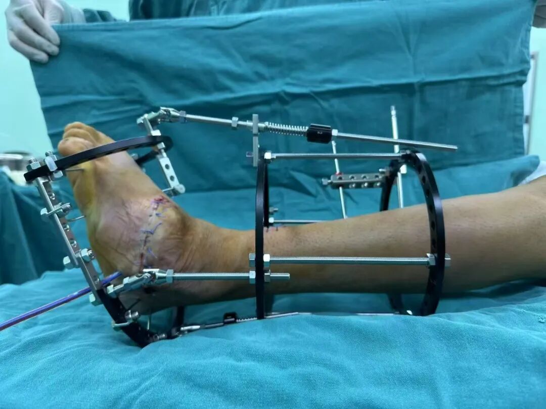 針對(duì)陽先生的復(fù)雜情況,鄭群龍醫(yī)師團(tuán)隊(duì)制定了詳盡的手術(shù)方案:左踝關(guān)節(jié)融合+馬蹄足畸形矯正+跟腱延長+外固定架固定術(shù)。手術(shù)的核心,正是伊里扎洛夫技術(shù)。這項(xiàng)技術(shù)如同精密的“時(shí)空建筑學(xué)”,通過微創(chuàng)安裝環(huán)形外固定架,前足-后足安裝鋼環(huán),再將足的鋼環(huán)與脛骨的固定鋼環(huán)在踝關(guān)節(jié)前、后、左、右用帶關(guān)節(jié)的螺紋桿連接,由此構(gòu)建成一個(gè)能體外牽拉調(diào)控的三維立體構(gòu)型,在術(shù)后進(jìn)行精準(zhǔn)、緩慢的調(diào)整,一寸一寸逐步將畸形的骨骼、軟組織恢復(fù)到正常位置。