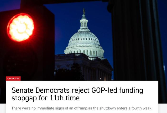 該法案原計劃將政府資金延長至11月21日,最終以50票贊成、43票反對未達(dá)通過所需的60票門檻。