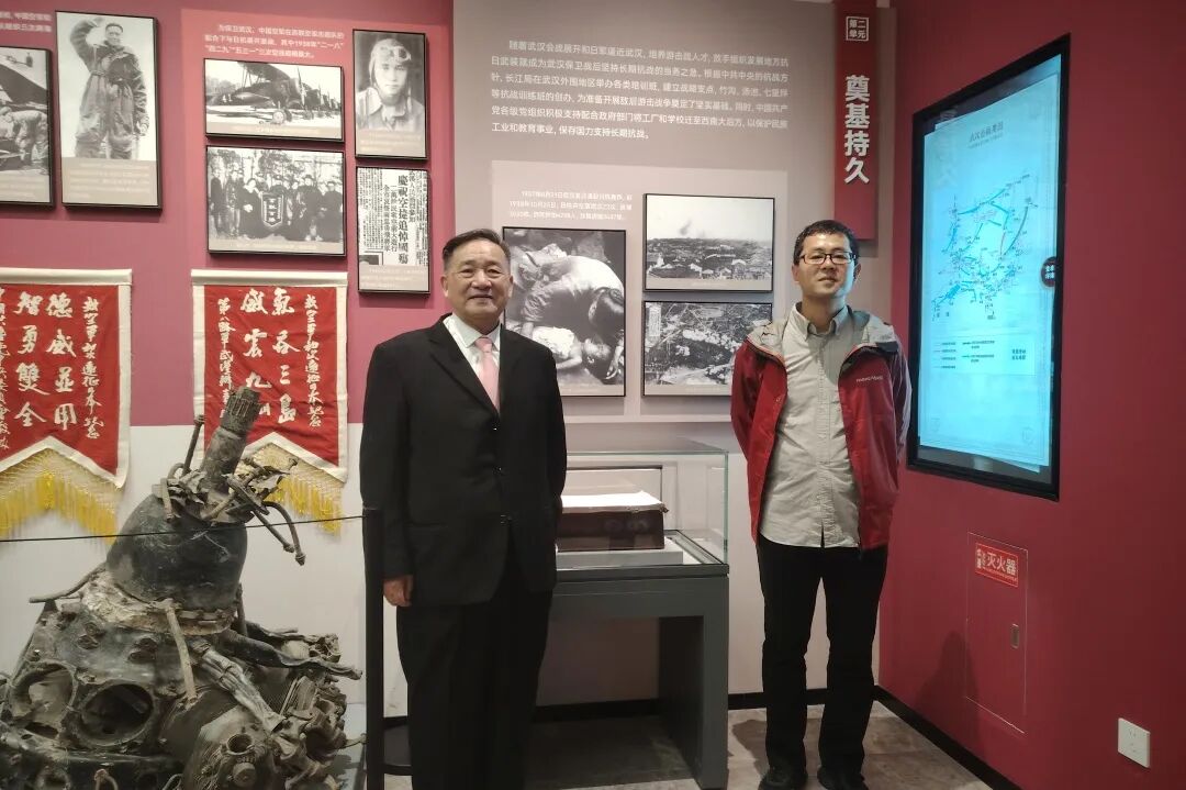 在空軍勇士陳懷民烈士相關(guān)展板前,周靜館長(zhǎng)向小林拓也詳細(xì)介紹了陳懷民犧牲的相關(guān)史實(shí)以及中國(guó)空軍在武漢空戰(zhàn)中的英勇表現(xiàn),小林拓也對(duì)陳懷民等人的犧牲精神表示欽佩,并在陳懷民烈士遺物前與陳德合影留念。
