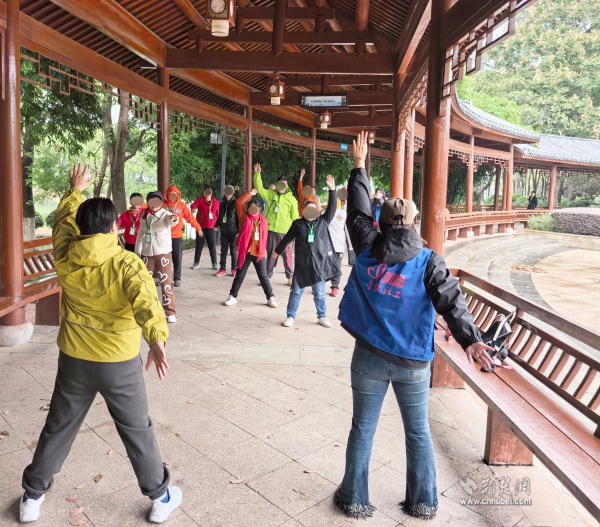 抵達(dá)公園后,全體人員在指導(dǎo)下進(jìn)行熱身操活動(dòng)。簡單的互動(dòng)游戲不僅驅(qū)散了清晨的涼意,也進(jìn)一步調(diào)動(dòng)了參與者的積極性,為后續(xù)游覽營造了輕松愉快的氛圍。
