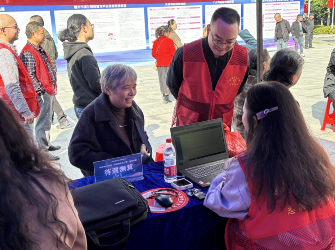 鄂州市“社保服務(wù)進萬家”主場活動現(xiàn)場,工作人員為即將退休的群眾測算社保待遇。