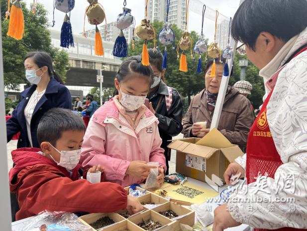 體驗(yàn)區(qū)里,社工帶領(lǐng)孩子們動(dòng)手制作茱萸香囊,講述“佩茱萸祈福避災(zāi)”的古老風(fēng)俗。孩子們捧著親手做好的香囊,迫不及待地想送給家里的長(zhǎng)輩。公益集市的人氣更是高漲,非遺絨花攤位展示傳統(tǒng)之美,慈善義賣(mài)匯聚鄰里愛(ài)心,植物醫(yī)生攤位傳遞健康養(yǎng)生理念。