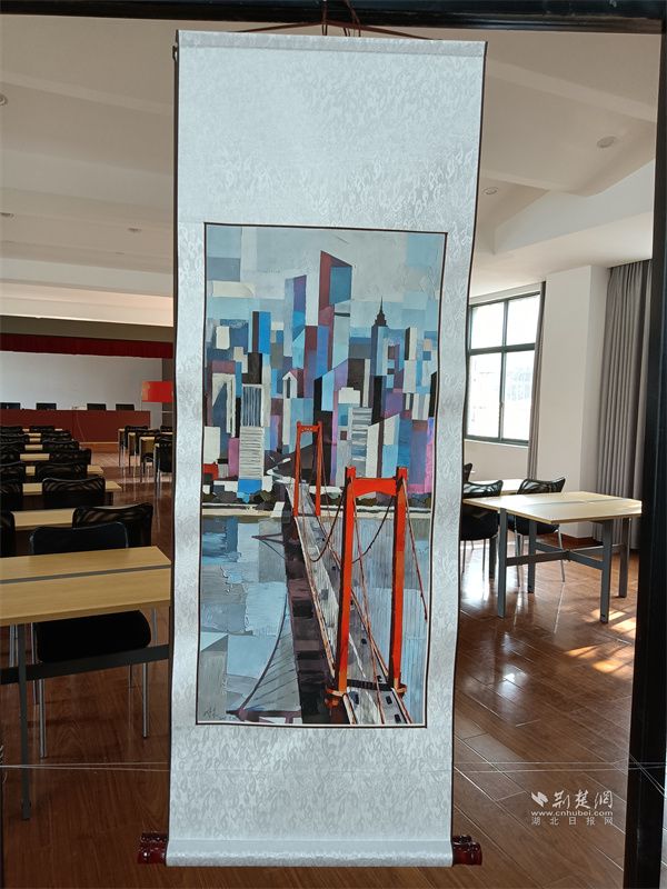在成年人作品展示區(qū),一幅采用微噴打印技術(shù)的作品,采用色塊拼接的藝術(shù)手法,巧妙地將鸚鵡洲長(zhǎng)江大橋與密集的高層建筑群相結(jié)合,共同勾勒出現(xiàn)代都市的壯麗景觀。另外一幅作品以工筆勾線為基礎(chǔ),結(jié)合平涂與暈染技法,生動(dòng)呈現(xiàn)黃鶴樓下高速列車飛馳而過的畫面,實(shí)現(xiàn)了“古今”時(shí)空對(duì)話的獨(dú)特場(chǎng)景。此外,還有融合素描與水彩技法的作品,以寫實(shí)風(fēng)格還原炭廠角省船宿舍的共享空間,傳遞出寧?kù)o院落的生活氣息?!敖窒镄骂佊吵?yáng)”和“鄰里情濃勝春暉”等書法佳作,以獨(dú)特的藝術(shù)形式彰顯了傳統(tǒng)文化的深厚魅力。