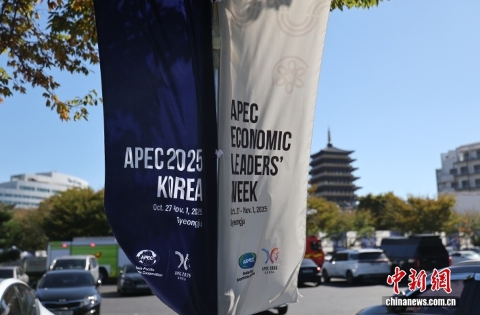 當(dāng)?shù)貢r(shí)間10月27日,韓國(guó)慶州火車站前的亞太經(jīng)合組織(APEC)標(biāo)識(shí)。中新社記者 劉旭 攝