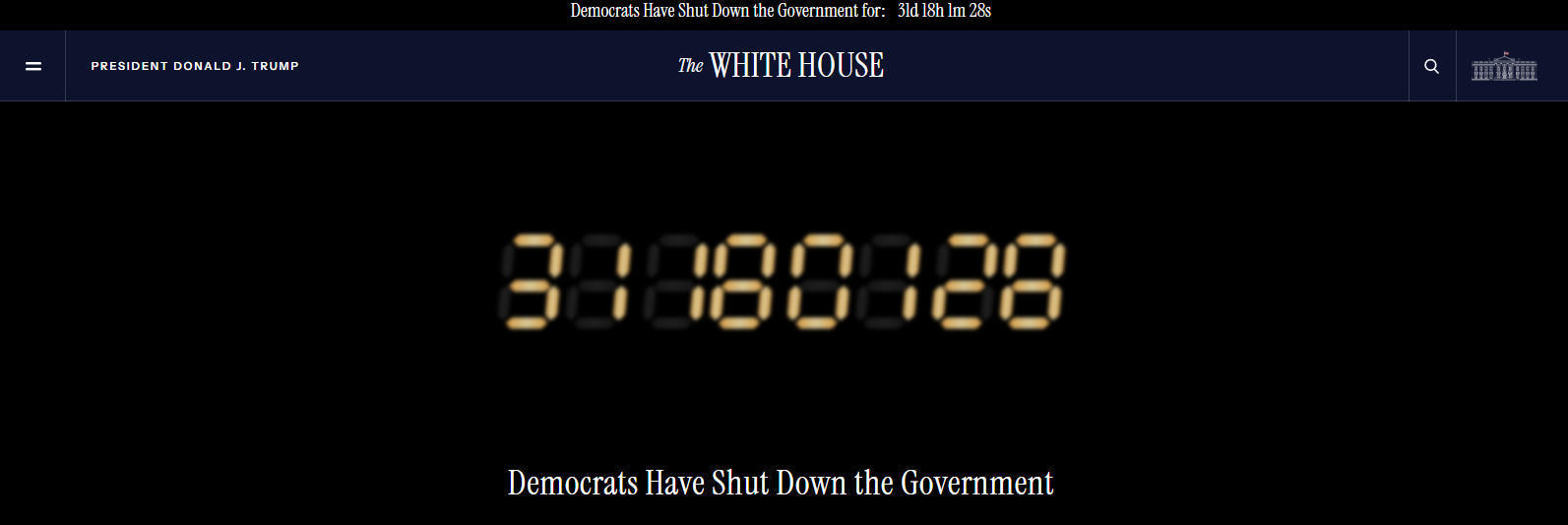 截至美東時(shí)間11月1日18時(shí)(北京時(shí)間11月2日6時(shí)),美國(guó)白宮官網(wǎng)實(shí)時(shí)刷新紀(jì)錄的這次美國(guó)政府“停擺”已經(jīng)持續(xù)了31天零18個(gè)小時(shí)。在白宮官網(wǎng)的頁(yè)面上,寫有“民主黨人關(guān)停了政府”的字樣。