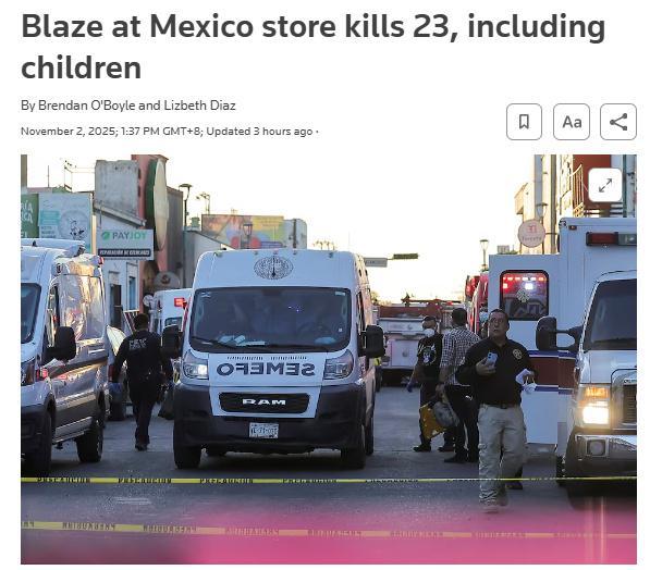 中新網(wǎng)11月2日電 據(jù)路透社報(bào)道,當(dāng)?shù)貢r(shí)間11月1日,墨西哥北部索諾拉州首府埃莫西約市一商店發(fā)生火災(zāi),目前已致至少23人死亡,10余人受傷。
