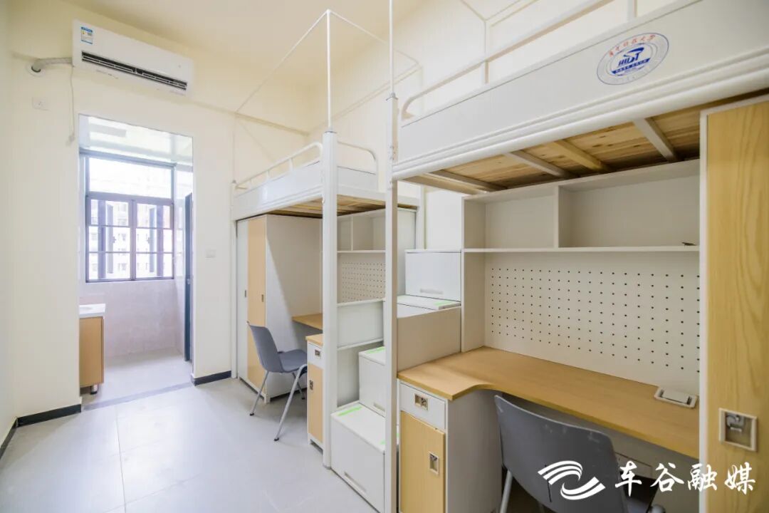 軍山校區(qū)建有7棟學(xué)生宿舍樓。北區(qū)的2棟主要面向本科生,以四人間為主。南區(qū)的5棟主要面向研究生,碩士生宿舍為兩人間,博士生宿舍為八人套房。宿舍樓一層為公共空間與服務(wù)樞紐,設(shè)有接待前臺,提供寄存、維修、反饋等服務(wù),設(shè)有多功能學(xué)習(xí)與活動空間、自習(xí)室、研討室、黨團活動室、咨詢室,滿足多種需求。二層及以上是住宿區(qū),電梯直達、功能完善,公共服務(wù)區(qū)配備洗衣機、烘干機、洗鞋機、直飲機。宿舍采用智能門鎖,上床下桌,獨立衛(wèi)浴,多功能學(xué)習(xí)桌搭配人體工學(xué)座椅,為學(xué)生提供舒適的學(xué)習(xí)住宿環(huán)境。
