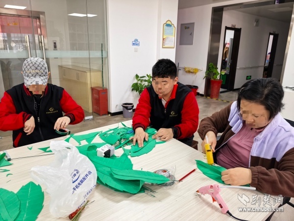 在為期兩周的創(chuàng)作中,陽光家園學(xué)員在志愿者的陪伴下,從設(shè)計畫圖、精準(zhǔn)剪裁到立體塑形、精細組裝,系統(tǒng)學(xué)習(xí)并逐步掌握了銀杏葉與玫瑰花的制作技巧?!暗谝淮螀⑴c制作這么大的藝術(shù)作品,沒想到我也能創(chuàng)造出這么美的作品!”一位學(xué)員自豪地展示成果。創(chuàng)作過程中,殘健伙伴分工協(xié)作、各展所長,在默契配合中締結(jié)了深厚情誼。