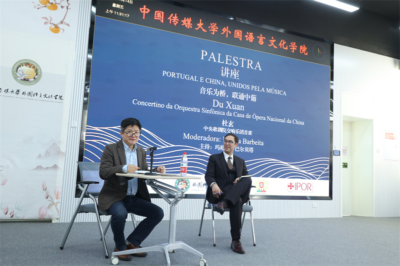 中央歌劇院交響樂(lè)團(tuán)首席杜玄(左)與葡萄牙駐華使館教育及文化專員路易斯·佩斯塔納(右)進(jìn)行分享。活動(dòng)主辦方供圖