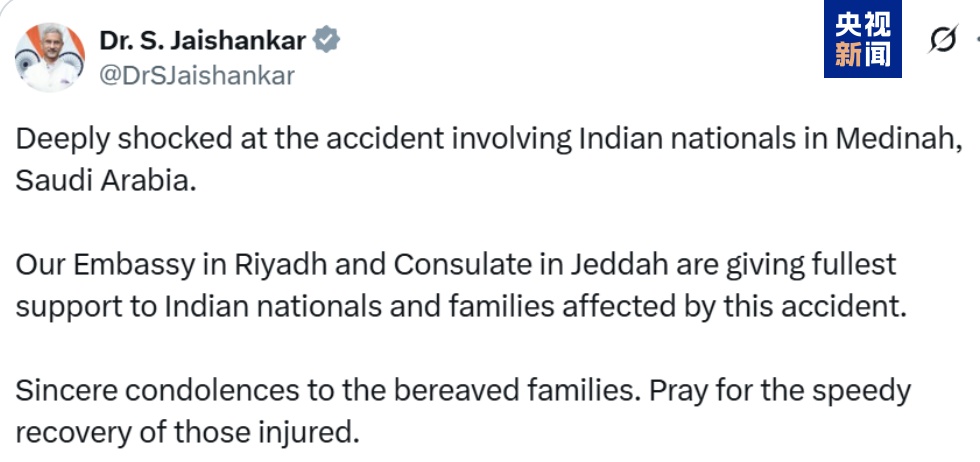 蘇杰生發(fā)表聲明稱,對在麥地那發(fā)生的涉及印度公民的事故深感震驚,并稱印度駐利雅得大使館和駐吉達領事館正在全力支持受此次事故影響的印度公民及其家屬。(總臺記者 張玥 張亞寧)