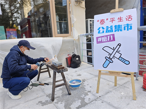 工會(huì)志愿者楊運(yùn)來為居民打磨刀具。 通訊員供圖