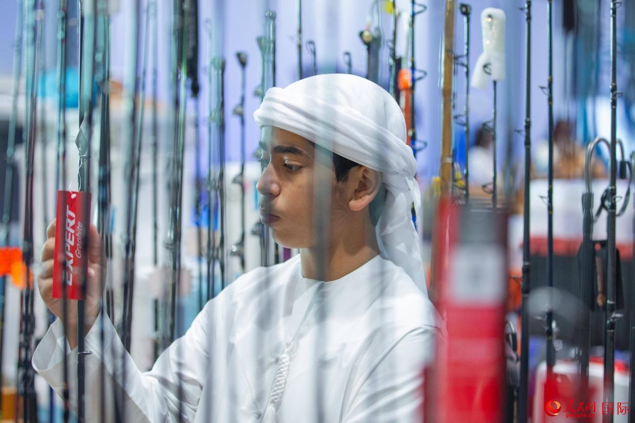 一位小觀眾在了解釣魚裝備。人民網 塔里克·易卜拉欣攝