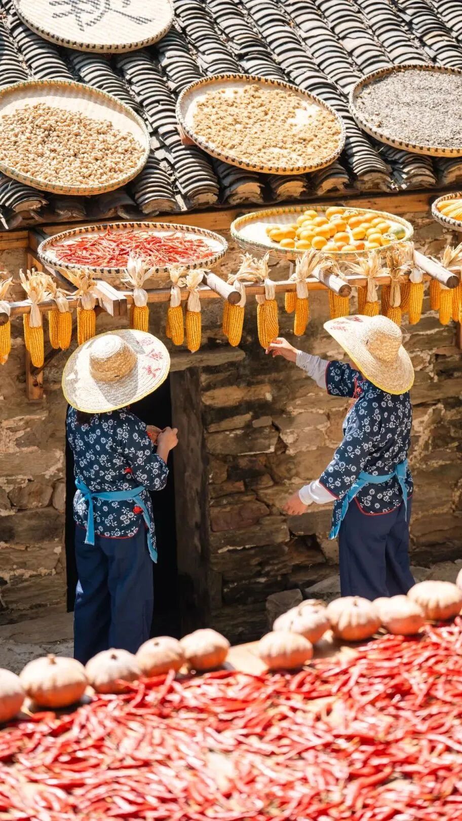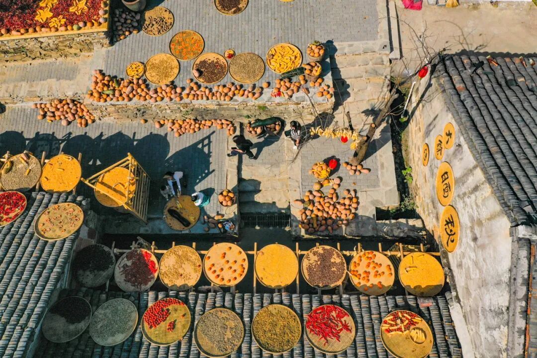 這不是擺設(shè)或表演,是真實(shí)的生活場(chǎng)景。家家戶(hù)戶(hù)門(mén)口擺放的竹匾里,晾曬的是他們一年勞作的收獲。