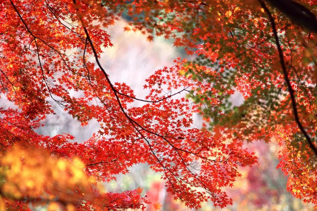 綿延的山谷像打翻的調(diào)色盤(pán),紅色是主調(diào),其間點(diǎn)綴著金、橙和綠色,錯(cuò)落有致,構(gòu)成一幅溫暖的秋景長(zhǎng)卷。