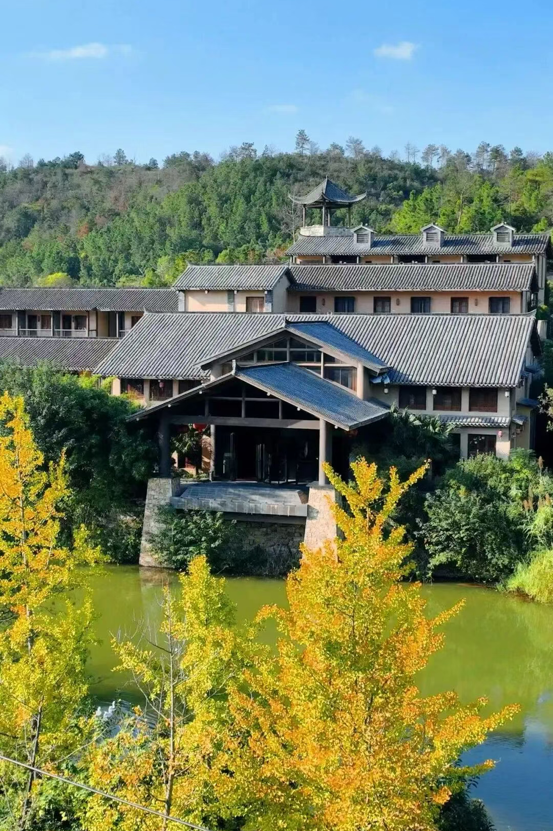 3. 梯田觀(guān)景處以銀杏與烏桕色彩為前景,遠(yuǎn)山為背景,呈現(xiàn)層次豐富的秋色。