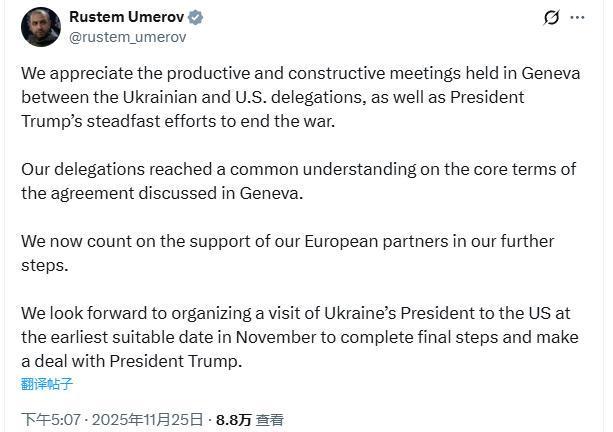 烏克蘭國家安全與國防委員會(huì)秘書烏梅羅夫則于同日在社交媒體上公開表態(tài)稱,美烏雙方代表團(tuán)已就在日內(nèi)瓦討論的協(xié)議的核心內(nèi)容上,達(dá)成一致。