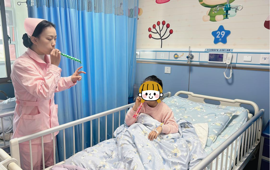 “來,一二三吸氣,一二三呼氣,慢慢吹……”胡祎夢一邊溫柔地喊著口令,一邊用彩色長管做著示范。這并非簡單的游戲互動,而是針對患兒設計的主動呼吸循環(huán)技術趣味教學——將專業(yè)的康復訓練轉化為“吹吸管挑戰(zhàn)”,讓小朋友在輕松的氛圍中自然掌握呼吸節(jié)奏控制技巧。這種寓教于樂的方式,不僅有效鍛煉了患兒的呼吸肌功能、助力痰液排出,更成功驅散了疾病治療帶來的枯燥與焦慮,讓病房里的康復訓練充滿歡聲笑語。