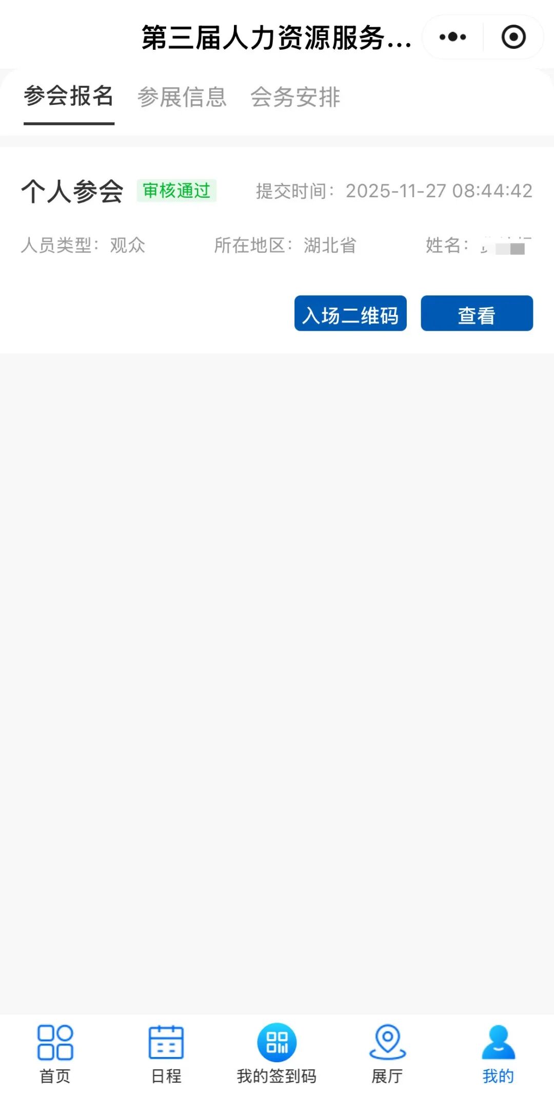 2.填寫報(bào)名信息。依次輸入人員類型、姓名、性別等內(nèi)容后,點(diǎn)擊提交按鈕,即可報(bào)名成功,報(bào)名成功后,可在“我的簽到碼”中查看入場(chǎng)二維碼及報(bào)名信息。