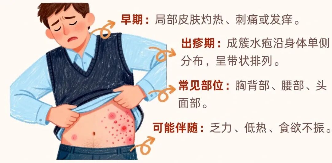典型癥狀:出疹前常有皮膚灼熱、刺痛或瘙癢等前驅(qū)癥狀,隨后出現(xiàn)帶狀排列的紅斑、水皰。其最顯著的特點是皮疹通常局限于身體一側(cè),不超過中線。