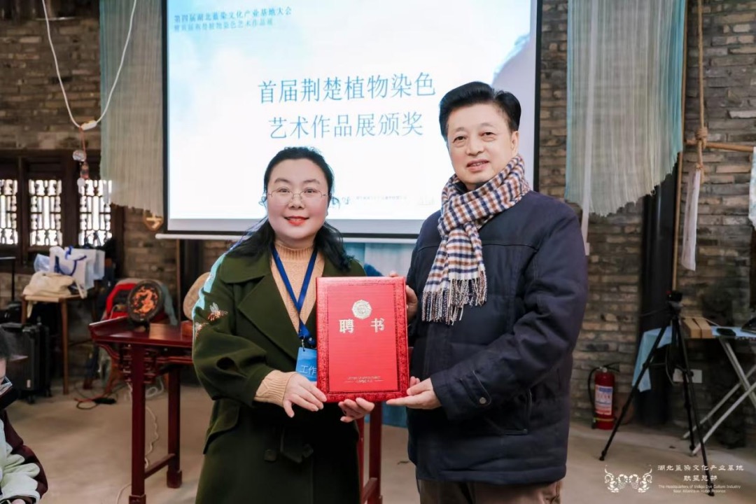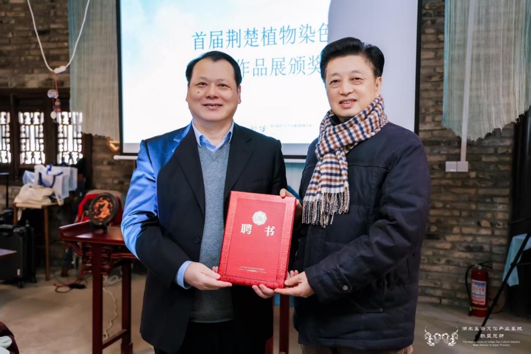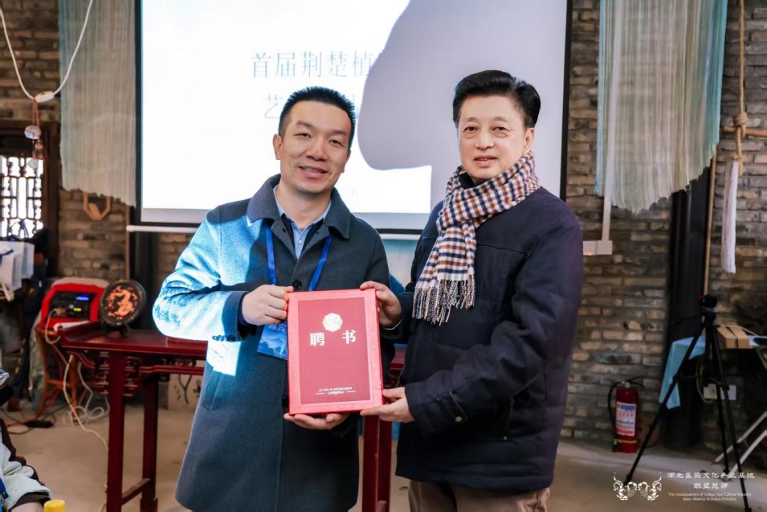 大會舉行了新一屆聯(lián)盟任職授聘儀式,聘請華中師范大學國家文化產業(yè)研究中心主任孫傳明教授擔任湖北藍染文化產業(yè)基地聯(lián)盟主席,華中師范大學研究員石煒、西安美術學院教授石歷麗、武漢紡織大學副教授王妮、黃岡藍靛染色省級非遺傳承人陳小蓮擔任湖北藍染文化產業(yè)基地聯(lián)盟副主席。湖北中華文化促進會常務副主席肖安民向孫傳明、石煒、石麗歷、王妮、陳小蓮頒發(fā)聯(lián)盟聘任證書。聯(lián)盟主席孫傳明向王子丹、于棟、孟小琴和楊青華頒授聯(lián)盟秘書長聘書,向陳玲、王玲超、朱小妮、程利頒授聯(lián)盟副秘書長聘書;聯(lián)盟副主席石煒向武漢紡織大學郭海燕副教授頒授藍染文化產業(yè)基地聯(lián)盟特聘秀導聘書。