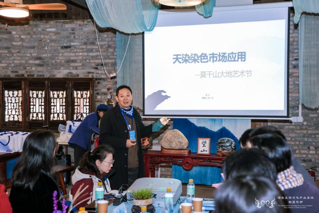 論壇環(huán)節(jié)分為“專家論壇”與“傳承人論壇”兩大板塊。在專家論壇板塊,華中師范大學國家文化產業(yè)研究中心孫傳明教授分享了“AI時代紡織類非遺的創(chuàng)新性發(fā)展”,并通過豐富的案例探討了AI技術對紡織印染類非遺的創(chuàng)新性轉化與創(chuàng)造性發(fā)展。西安美術學院石歷麗教授分享了“以染為媒,以美賦能,共創(chuàng)鄂陜融合發(fā)展”的思考。德清集彩文化創(chuàng)意有限公司宋立董事長分享了“天然染色市場應用”。中國紡織工程學會非遺印染科普傳播專家、武漢紡織大學王妮副教授分享了“中國紡織非遺印染專題研究概述”。在傳承人論壇板塊,多位來自武漢、宜昌、襄陽、黃岡、天門、江夏等地的非遺傳承人,結合自身實踐,講述了藍染技藝在當代的守正創(chuàng)新、工坊運營與公益融合之路。其中,襄陽鴻岳扎染坊主理人朱小妮分享了以植物染技藝助力自閉癥青年就業(yè)的實踐,展現(xiàn)了非遺融入公益、賦能特殊群體的社會溫度。