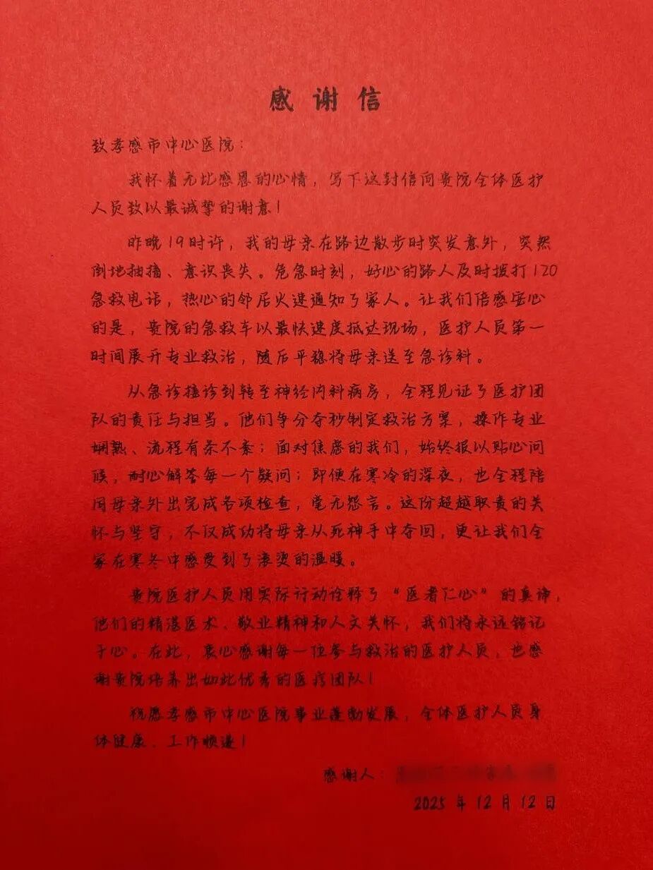 這封感謝信,不僅是對孝感市中心醫(yī)院醫(yī)護(hù)團(tuán)隊的最高褒獎,更是這個冬天里,醫(yī)患關(guān)系最溫暖的注腳。