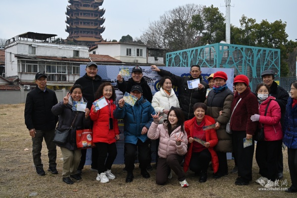 快閃活動(dòng)選址社區(qū)黃鶴游園,抬頭即見巍巍黃鶴樓?,F(xiàn)場(chǎng),82歲守井人謝邦純老人與社區(qū)工作人員、青年學(xué)子一同講述“三井一臺(tái)”的故事,帶領(lǐng)在場(chǎng)居民穿越時(shí)空,觸摸楚王府遺韻與市井生活記憶。