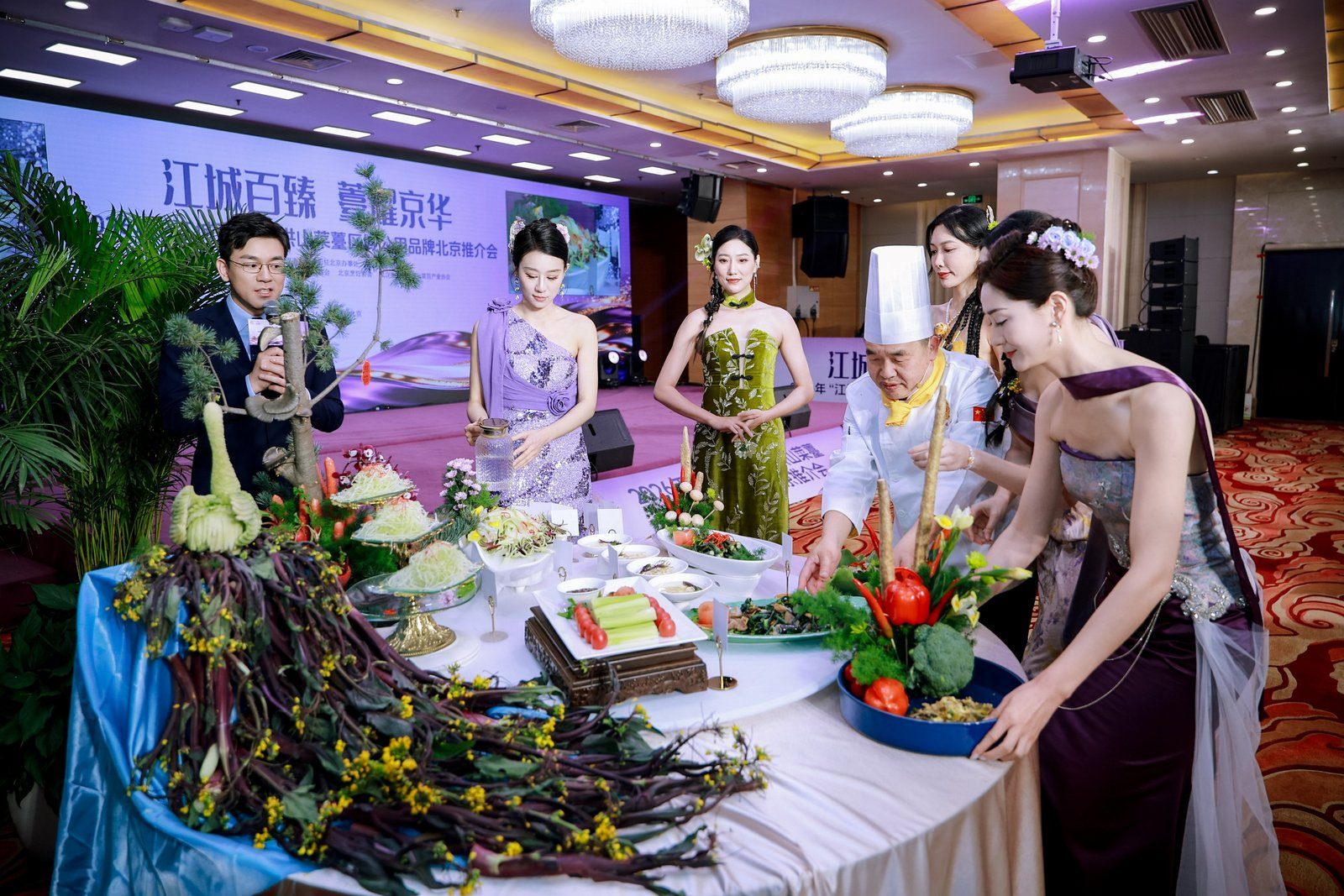 活動現場,《千年一“薹”,京誠所愛》情景劇生動詮釋洪山菜薹的傳承與創(chuàng)新,產品走秀與藝術插花表演凸顯其美學價值,楚菜名廚現場演繹“一薹多吃”宴席,展現菜薹融入京鄂風味的烹飪創(chuàng)意。京城網紅大廚隋坡登臺品鑒,為洪山菜薹實力“打call”?,F場同步設置國風市集,展出鮮薹、鎖鮮產品及禮盒,供嘉賓品鑒體驗。