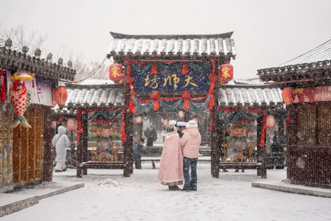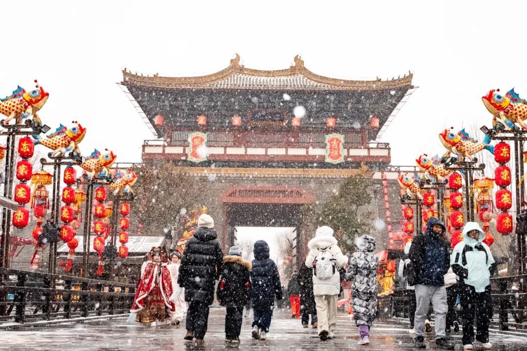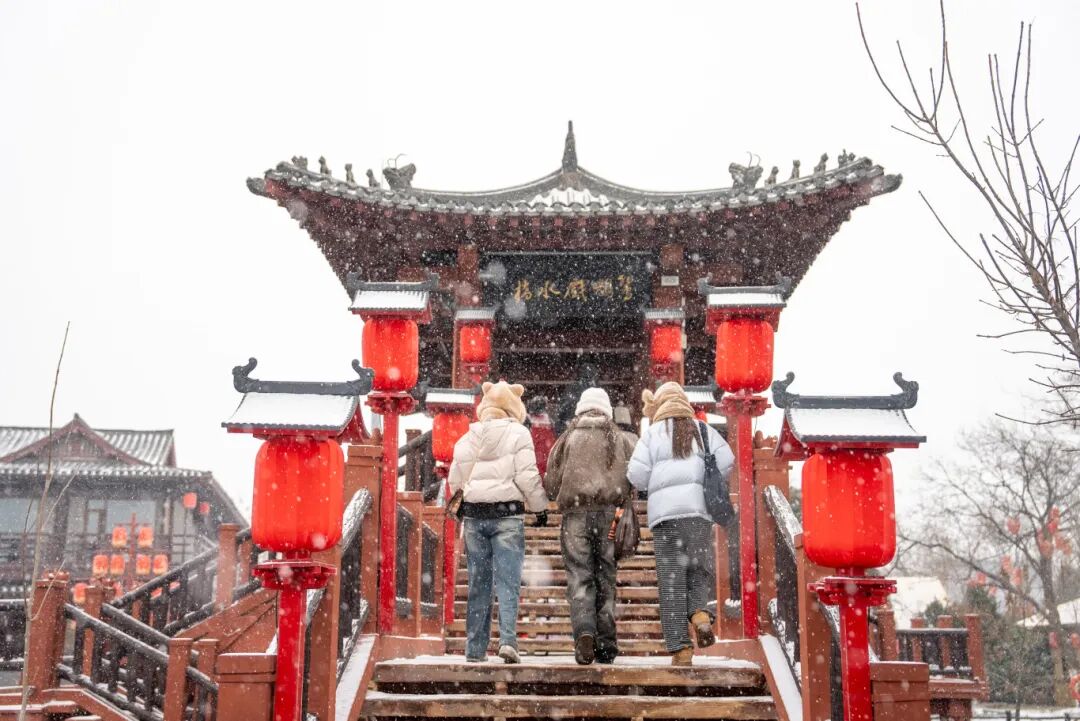 也可以換一身素雅的漢服,漫步在虹橋之上,讓雪花綴滿肩頭,融入雪景版的《清明上河圖》,與千年風雅撞個滿懷。