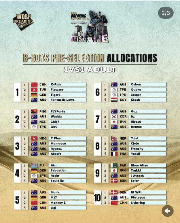 1月17日至18日,由世界體育舞蹈聯(lián)合會(WDSF)主辦、澳大利亞體育舞蹈聯(lián)合會承辦的2026 WDSF World Breaking Dancesport Festival在澳大利亞布里斯班圓滿收官。本次霹靂舞比賽既是世界巡回積分賽,也是青奧會積分賽,不僅為全球頂尖霹靂舞運動員提供了高水準的競技舞臺,更旨在推動霹靂舞項目進入2032年布里斯班奧運會。中國霹靂舞隊表現(xiàn)搶眼,捷報頻傳。其中,我省運動員王瑞苗在個人賽男子組中過關(guān)闖將,并在決賽中以2:1戰(zhàn)勝日本名將Hiro 10成功奪冠,這不僅是他個人職業(yè)生涯的里程碑,也是省社體中心在WDSF賽事上獲得的首個世界冠軍。