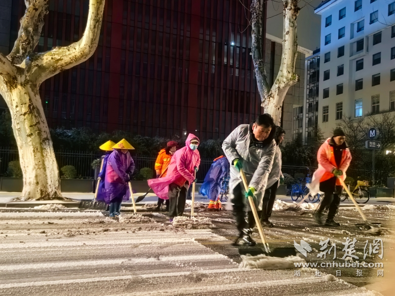 20日凌晨30分,武昌區(qū)中華路街道迅速組織力量,街道、轄區(qū)應(yīng)急分隊(duì)、環(huán)衛(wèi)工人、物業(yè)以及社區(qū)志愿者等80余人,連夜對(duì)中華路、解放路、民主路、都府堤路等重要干道展開連夜作業(yè);凌晨5時(shí),洪山區(qū)執(zhí)法中心組織力量對(duì)文治街、書城路沿線長(zhǎng)達(dá)1.2公里的人行道展開"地毯式"清障,累計(jì)清除積雪積冰約2000平方米;早上6時(shí),江岸區(qū)花橋街道380余人的除雪隊(duì)伍集中對(duì)校園周邊、小區(qū)出入口、主干道人行道的積雪進(jìn)行重點(diǎn)清掃,累計(jì)清理積雪約0.8噸。